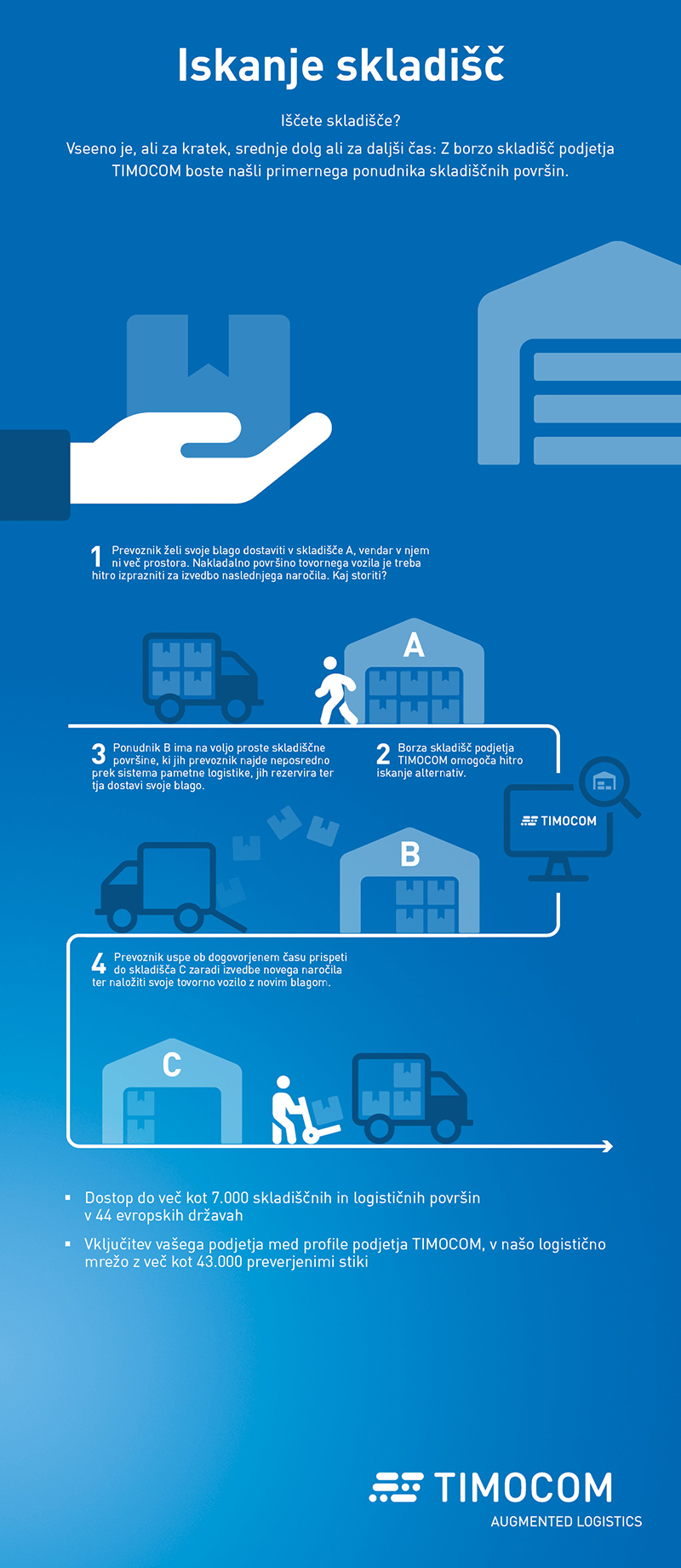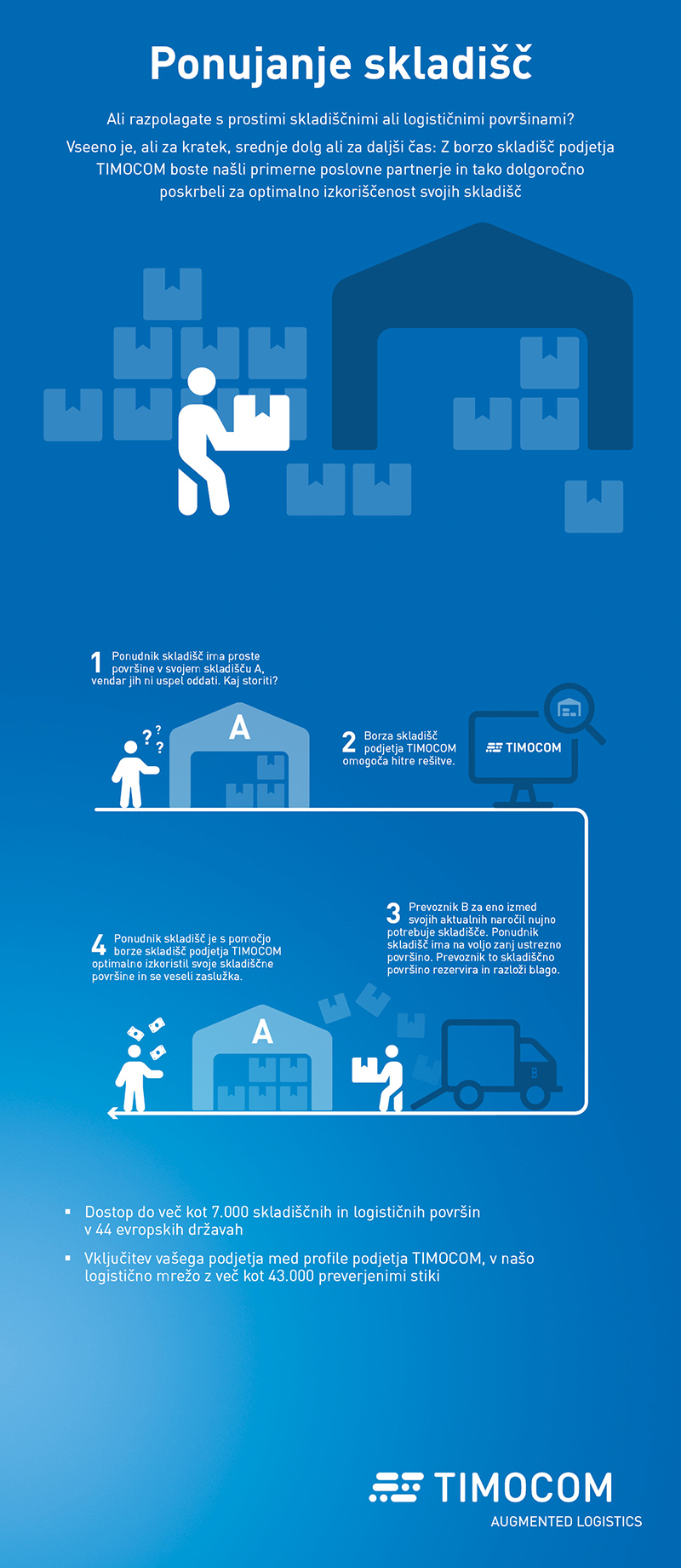 Imate skladišče in ga želite optimalno izkoristiti? Ali iščete ustrezne skladiščne površine? Potem imamo rešitev za vas: Na trgu podjetja TIMOCOM vam ponujamo tudi borzo skladišč. Ta predstavlja daleč največjo B2B mrežo raznovrstnih skladiščnih površin v Evropi – brez dodatnih stroškov. Kot uporabniku trga vam je na voljo dostop do več kot 9.000 skladiščnih in logističnih površin iz 46 evropskih držav. Po potrebi lahko prejemate ali vnašate ponudbe skladiščnih površin in takoj stopite v stik z morebitnimi poslovnimi partnerji.